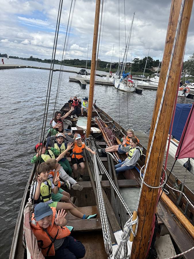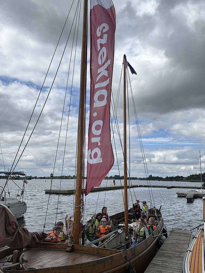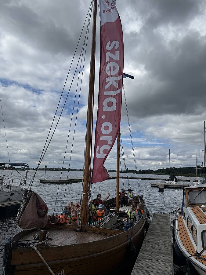 1) jedna grupa pływa na zabytkowym jachcie 12 os. : 10 uczestników + nauczyciel+ sternik Szekli